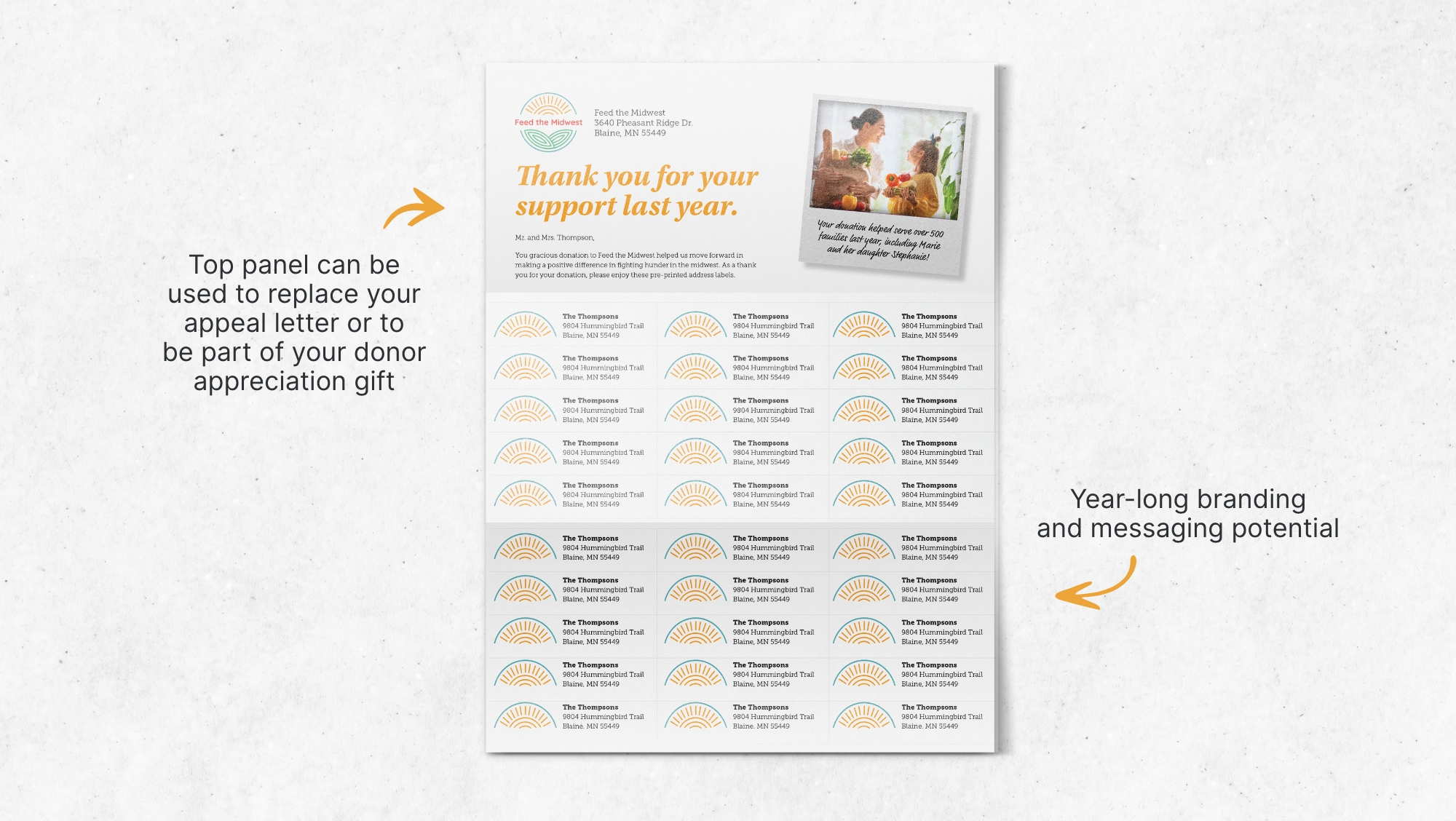 Adding a personalized gift is a great way to increase engagement and response. Designed to fit inside a #10 envelope, these address labels can be used with our appeal or welcome packages.
